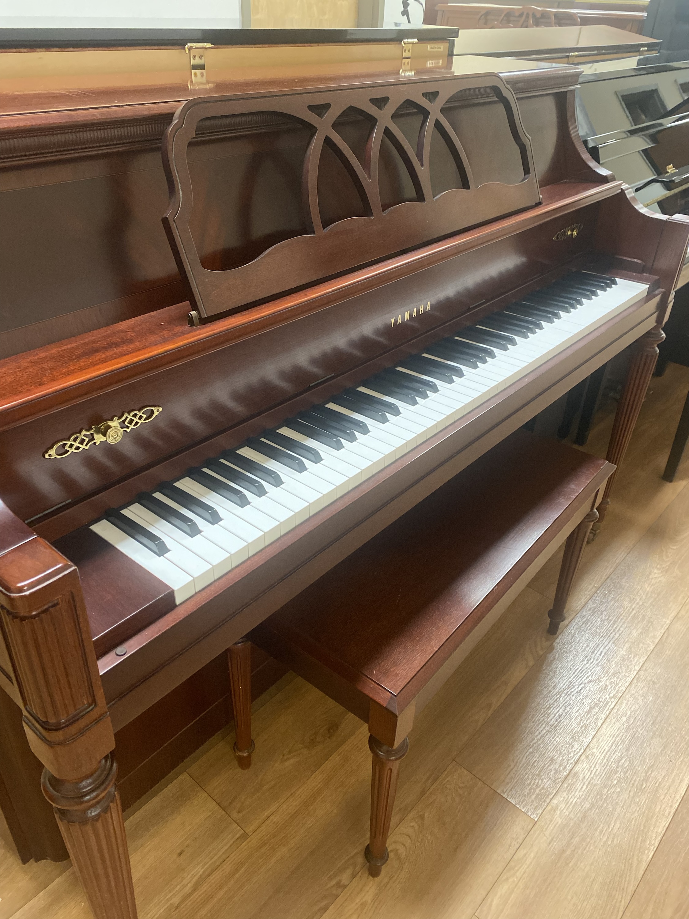 The Yamaha M500 G Custom Upright Piano is a true gem, crafted in 2004/2005, and features a mahogany satin finish with stunning inlay furniture details. This model blends timeless elegance with Yamaha’s signature craftsmanship, making it an ideal centerpiece for any home or studio.